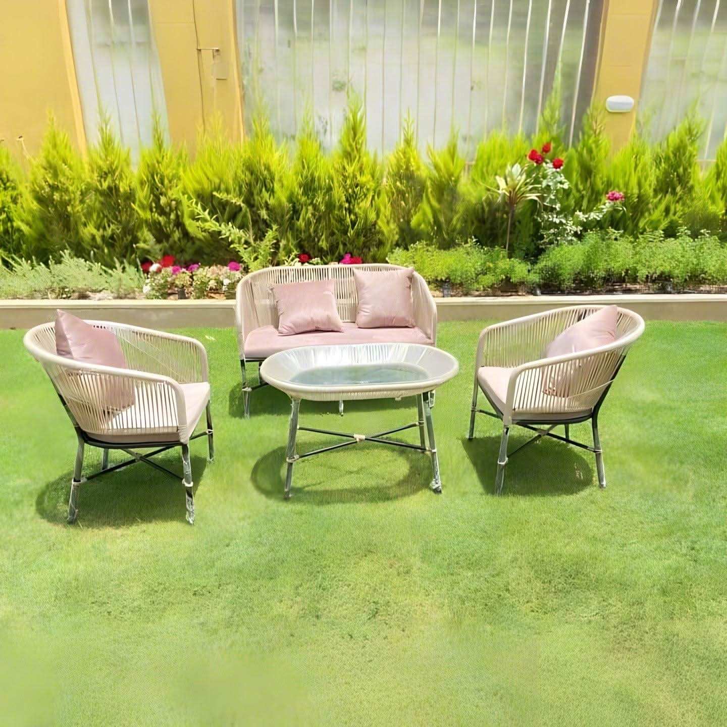كراسي و ترابيزة مصنعه من الدوبار حيث الدوبار مجدول على حديد سميك مدهون فرن الكتروستاتيك ضد الصدأ و العوامل