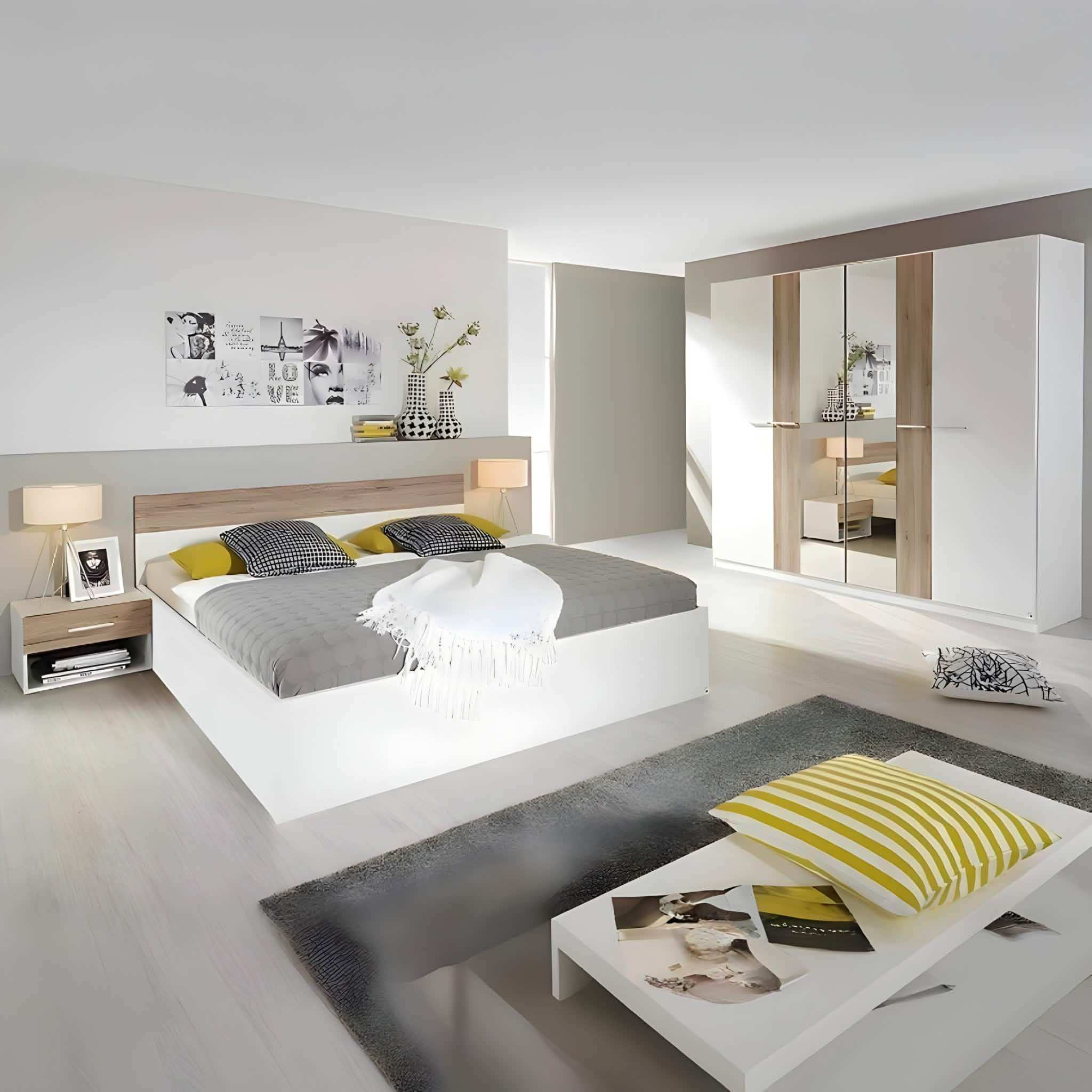 • محتويات الغرفة: – 1 سرير كينج – 2 كومود – 1 دولاب• مقاسات السرير: – العرض 160 × الطول 200 × الارتفاع 115 سم• مقاسات الدولاب: – العرض 200 × العمق 50 × الارتفاع 200 سم• مقاس الكومودينو: – العرض 50 × العمق 40 × الطول 40 سم• خامة الخشب: خشب ام دي اف• خامة ألواح السرير: خشب موسكى• اللون: أبيض × بيج• كود المنتج: ROS15
