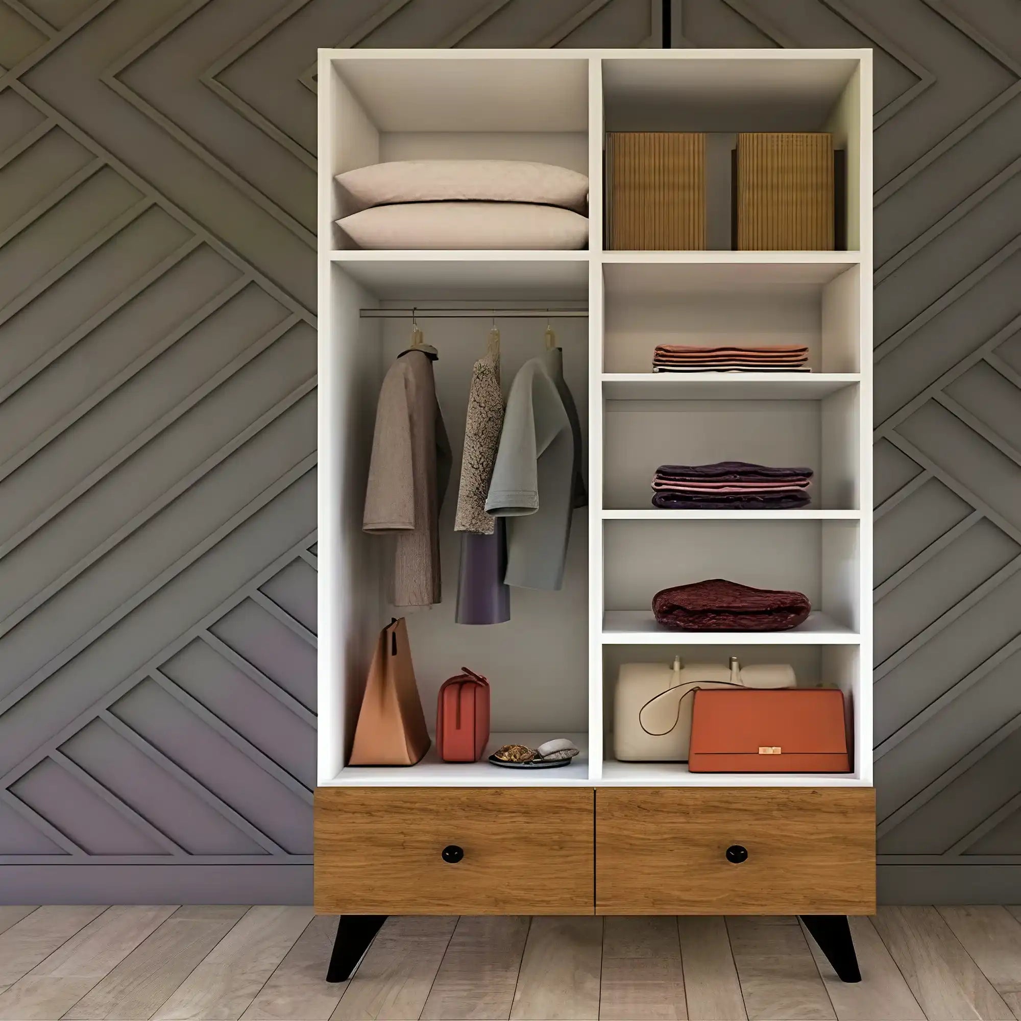 احصل على التنظيم والأناقة في غرفتك مع دولاب الملابس الخشبي الأنيق. مصنوع من الخشب ام دي اف ذو الجودة العالية بتصميم فريد وأنيق يضيف لمسة من الفخامة إلى ديكور غرفتك، يتميز بمساحة داخلية وفيرة مع رفوف وأدراج واسعة توفر وحدات تخزين مثالية لجميع أنواع الملابس والاكسسوارات الخاصة بك، يتناسب مع جميع الديكورات بفضل تصميمه العصري، يمكنك الان تنظيم مجموعتك من الملابس بكل سهولة والاحتفاظ بكل شيء في مكانه المناسب.