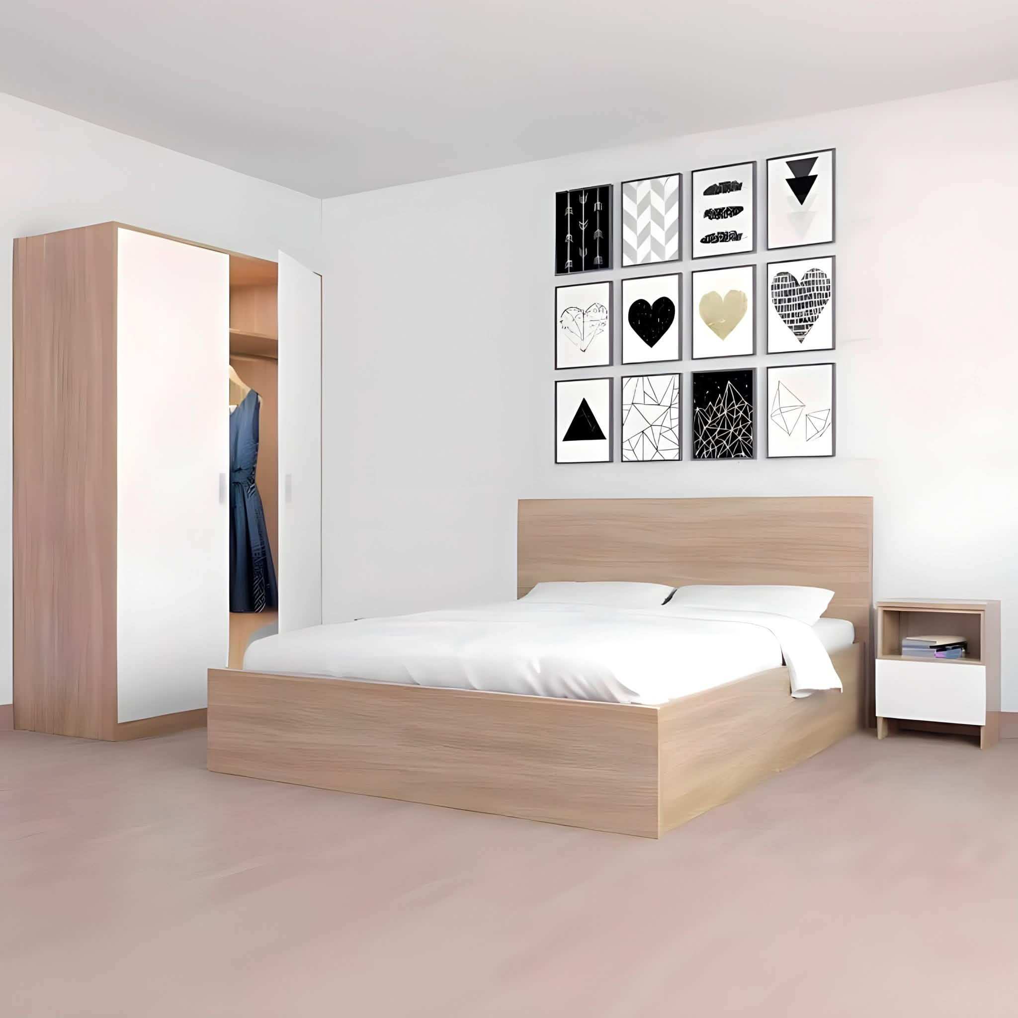 • محتويات الغرفة: – 1 سرير كينج – 1 كومود – 1 دولاب• مقاسات السرير: – العرض 160 × العمق 200 × الارتفاع 115 سم• مقاسات الدولاب: – العرض 140 × العمق 50 × الارتفاع 200 سم• مقاس الكومودينو: – العرض 40 × العمق 40 × الارتفاع 50 سم• خامة الخشب: خشب ام دي اف• خامة ألواح السرير: خشب موسكى• اللون: خشبي × أبيض• كود المنتج: ROS10