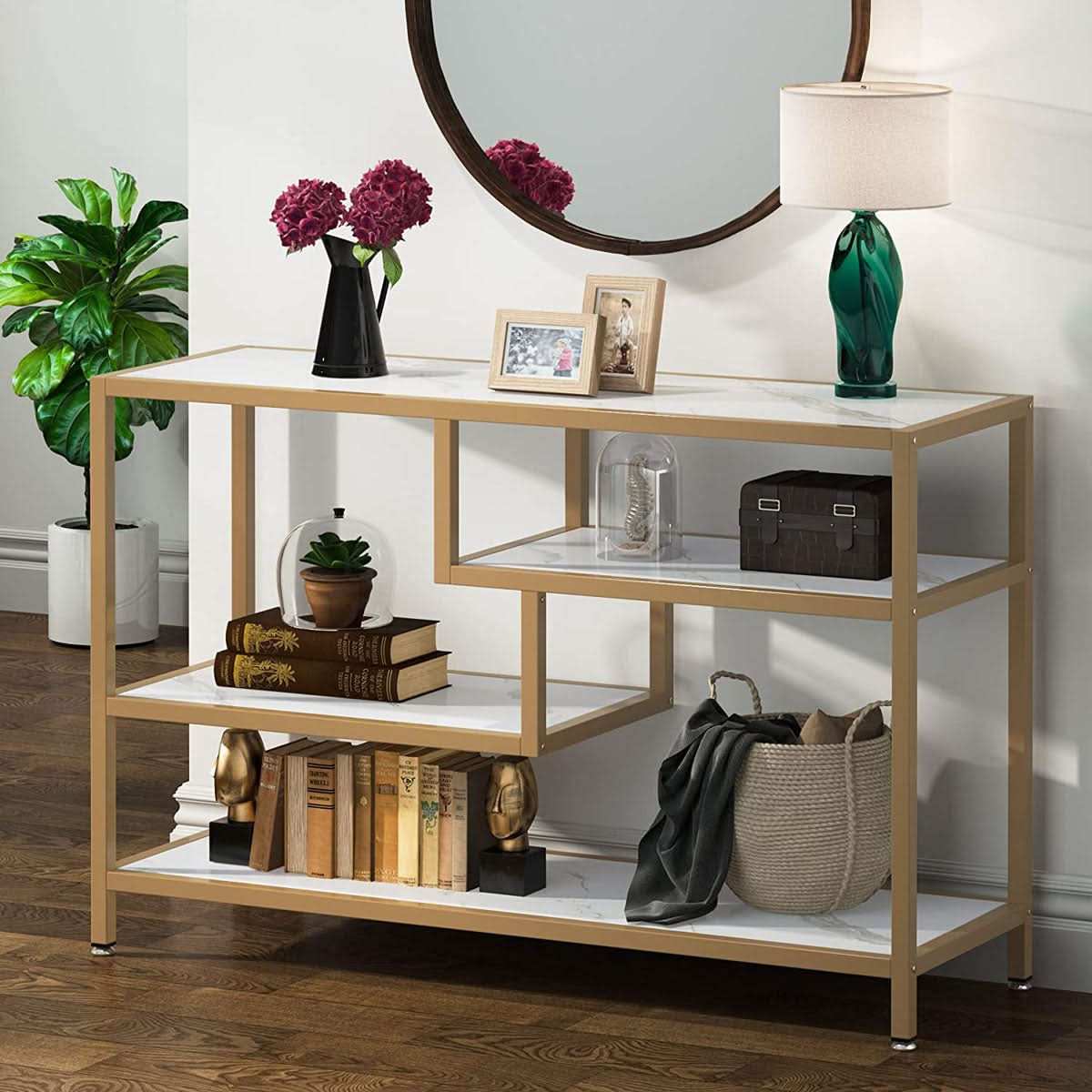 هو عنصر أنيق يضيف لمسة راقية وفخمة لأي مكان في منزلك. تصميمه الأنيق يمزج بين المعدن عالي الجودة وسطح الرخام الفاخر، مما يجعله ليس فقط قطعة أثاث عملية ولكن أيضًا عنصر ديكور يلفت الأنظار. هو الخيار المثالي. يوفر لك هذا الكونسول توازنًا مثاليًا بين الأناقة والوظائف العملية.