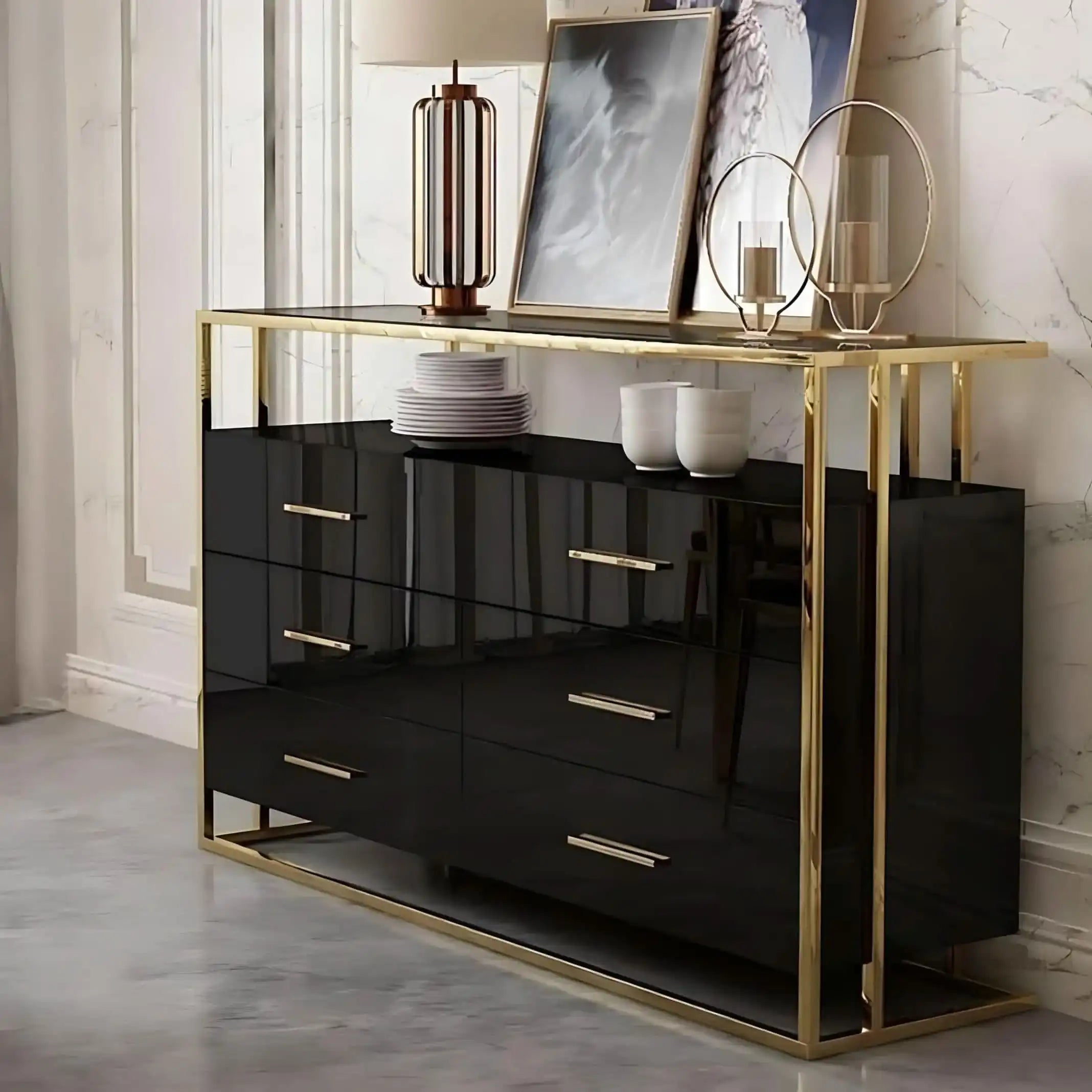 هذا البوفيه الأنيق مصمم من خشب اتش بي ال اللامع الذي يضمن لمسة عصرية وبراقة. يتميز بقاعدة من الاستانلس المقاوم للصدأ بطلاء بي في دي لامع، مما يضيف لمسة من الفخامة والصلابة. يحتوي البوفيه على ستة أدراج واسعة توفر مساحة كافية للتخزين والتنظيم بشكل أنيق. تصميمه العصري مع اللمسات اللامعة يعزز من جاذبية أي غرفة، ويمنحها لمسة من الأناقة والتميز.
