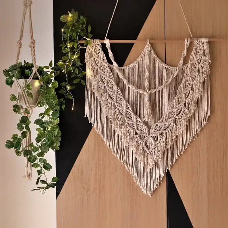 المكرمية الحائطية هي قطعة فنية تُستخدم عادة لتزيين الجدران، وتُصنع من خيوط مكرمية يتم ربطها بطريقة معقدة لتشكيل أنماط وأشكال زخرفية جميلة. تتكون المكرمية الحائطية من عقد متعددة تُستخدم لتشكيل تصاميم متنوعة مثل الأشكال الهندسية، والأزهار، والدوائر، والأنماط المتشابكة