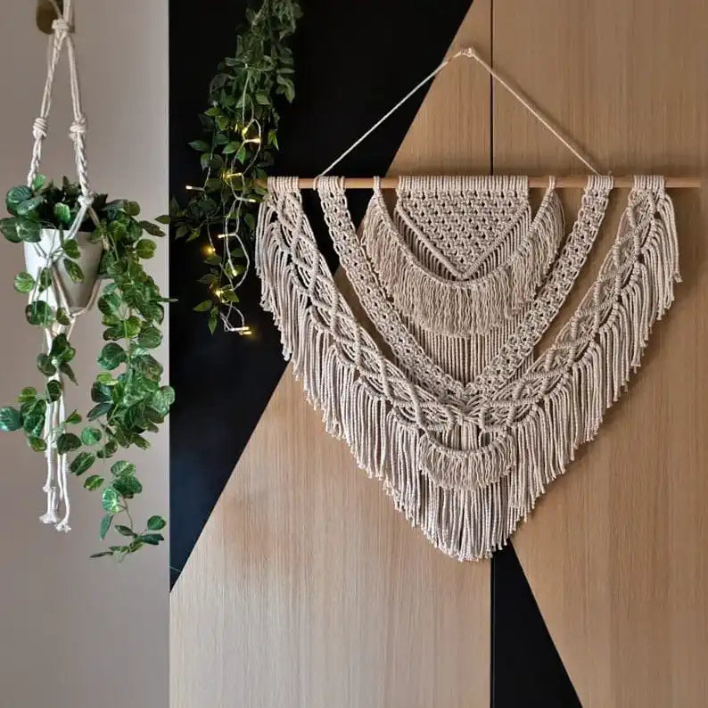 المكرمية الحائطية هي قطعة فنية تُستخدم عادة لتزيين الجدران، وتُصنع من خيوط مكرمية يتم ربطها بطريقة معقدة لتشكيل أنماط وأشكال زخرفية جميلة. تتكون المكرمية الحائطية من عقد متعددة تُستخدم لتشكيل تصاميم متنوعة مثل الأشكال الهندسية، والأزهار، والدوائر، والأنماط المتشابكة