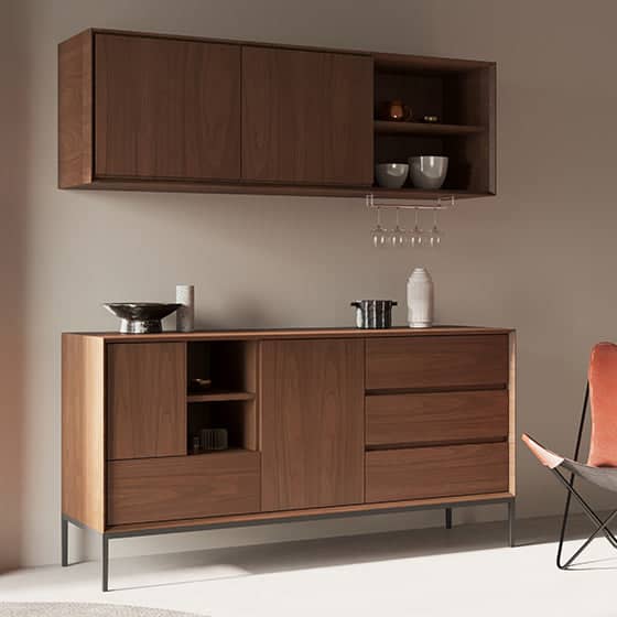 يتميز بوفيه الطعام بأرفف ووحدات تخزبن مميزة وبتصميم حديث يعمل بشكل جيد في تخزين الأدوات المنزلية. يتميز بلمسة نهائية محايدة تنسق مع أي ديكور تقريبًا ، كما أن سطح البوفيه المصنوع من الخشب الكونتر والأرجل المعدنية يمنحهه بنية صلبة ومتينة إلى جانب تصميم ممتع.