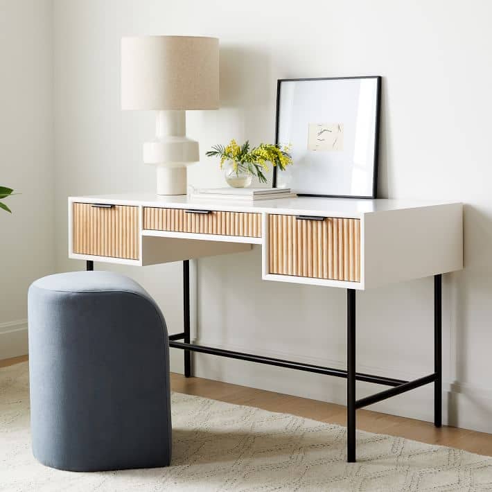 تتميز التسريحة بوحدات للتخزين المدمج والمفتوح بتصميم حديث تعمل بشكل جيد في كل من تخزين أدوات التجميل والأدوات المنزلية. تتميز بلمسة نهائية محايدة تنسق مع أي ديكور تقريبًا ، كما أن سطح التسريحة المصنوعة من الخشب الام دي اف والأرجل المعدنية يمنحها بنية متينة إلى جانب تصميم ممتع.