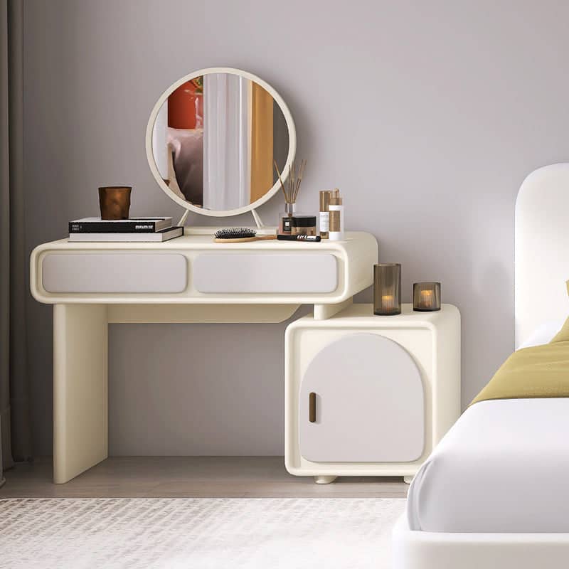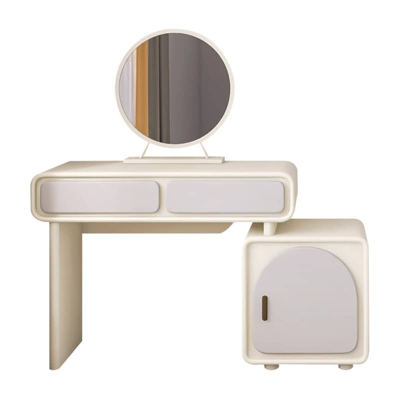 تتميز التسريحة بمرآة عملية ووحدات للتخزين المدمج والمفتوح بتصميم حديث تعمل بشكل جيد في كل من تخزين أدوات التجميل والأدوات المنزلية. تتميز بلمسة نهائية محايدة تنسق مع أي ديكور تقريبًا ، كما أن سطح التسريحة المصنوعة من الخشب ام دي اف والأرجل الخشبية يمنحها بنية متينة إلى جانب تصميم ممتع.