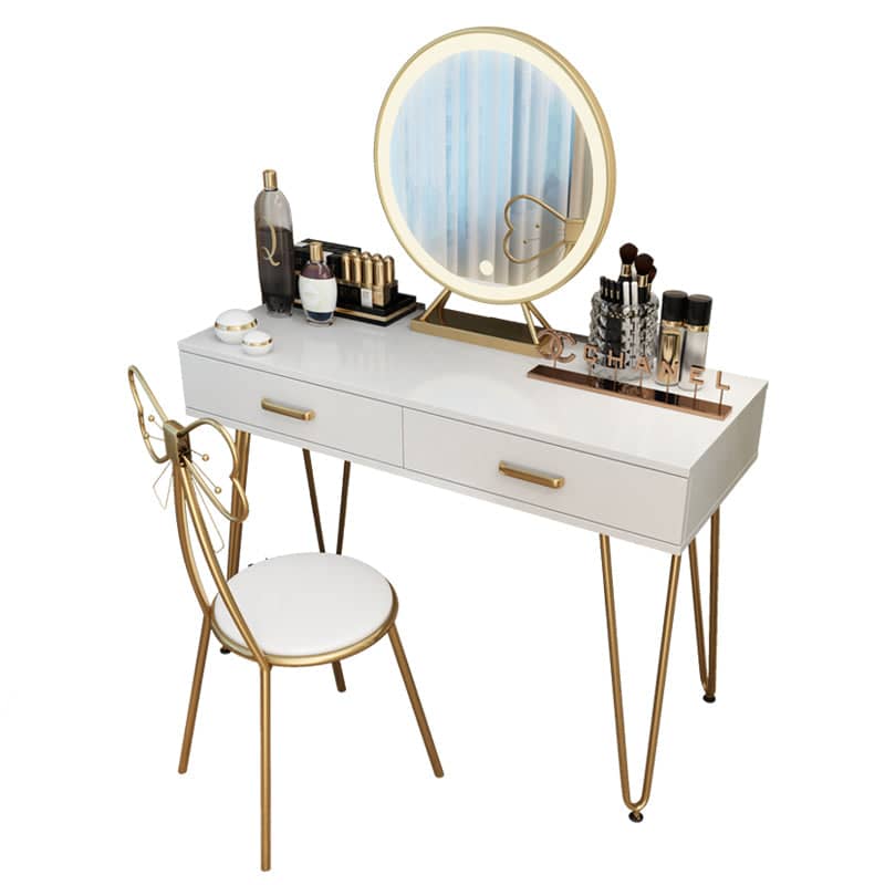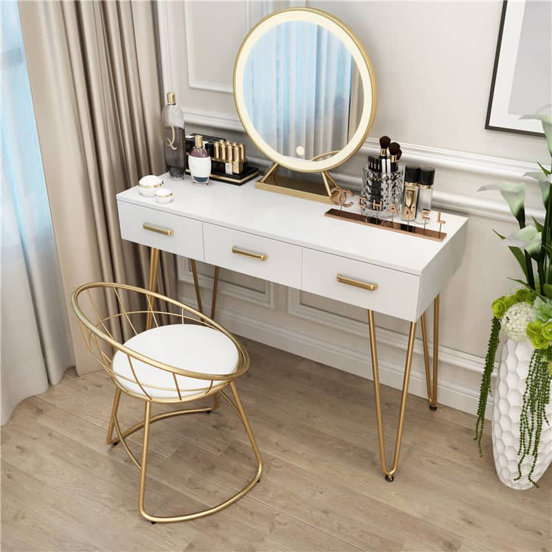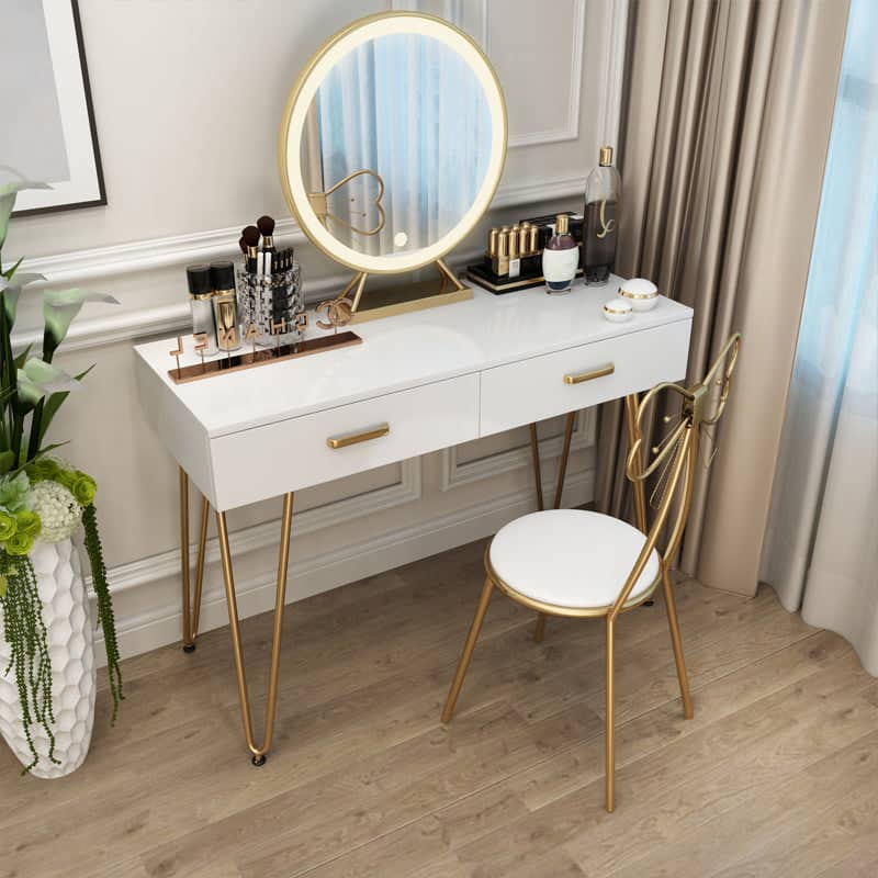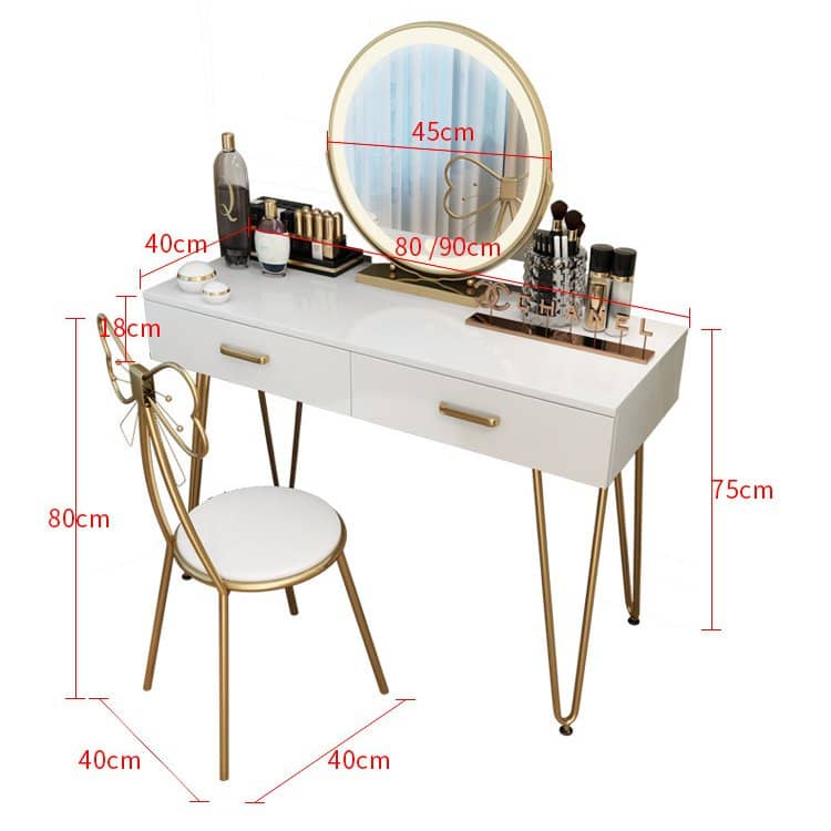 اللون : ابيض*ذهبيمقاس التسريحة : العمق 40 * العرض 90 - 80 * الارتفاع 75 سم / مقاس الكرسي : العمق 40 * العرض 40 * ارتفاع 80 سم