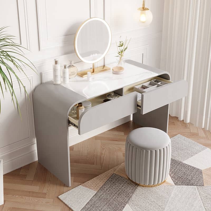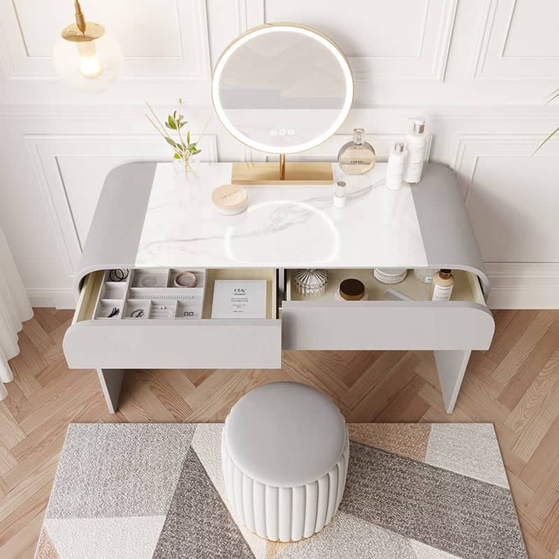 تتميز التسريحة بمرآة عملية ومقعد ووحدات للتخزين المدمج والمفتوح بتصميم حديث تعمل بشكل جيد في كل من تخزين أدوات التجميل والأدوات المنزلية. تتميز بلمسة نهائية محايدة تنسق مع أي ديكور تقريبًا ، كما أن سطح التسريحة المصنوعة من الخشب ام دي اف والأرجل الخشبية يمنحها بنية متينة إلى جانب تصميم ممتع.