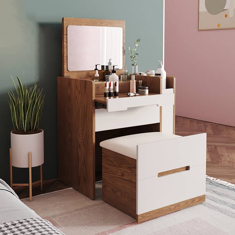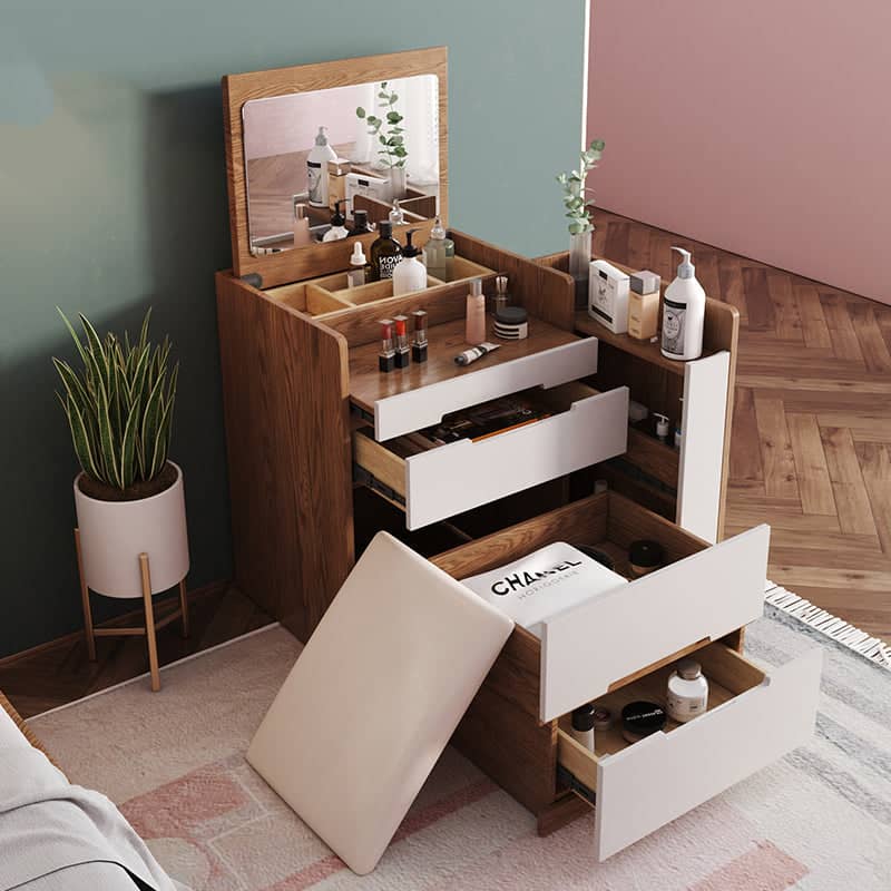 تتميز التسريحة بمرآة عملية ومقعد ووحدات للتخزين المدمج والمفتوح بتصميم حديث تعمل بشكل جيد في كل من تخزين أدوات التجميل والأدوات المنزلية. تتميز بلمسة نهائية محايدة تنسق مع أي ديكور تقريبًا ، كما أن سطح التسريحة المصنوعة من الخشب ام دي اف يمنحها بنية متينة إلى جانب تصميم ممتع.