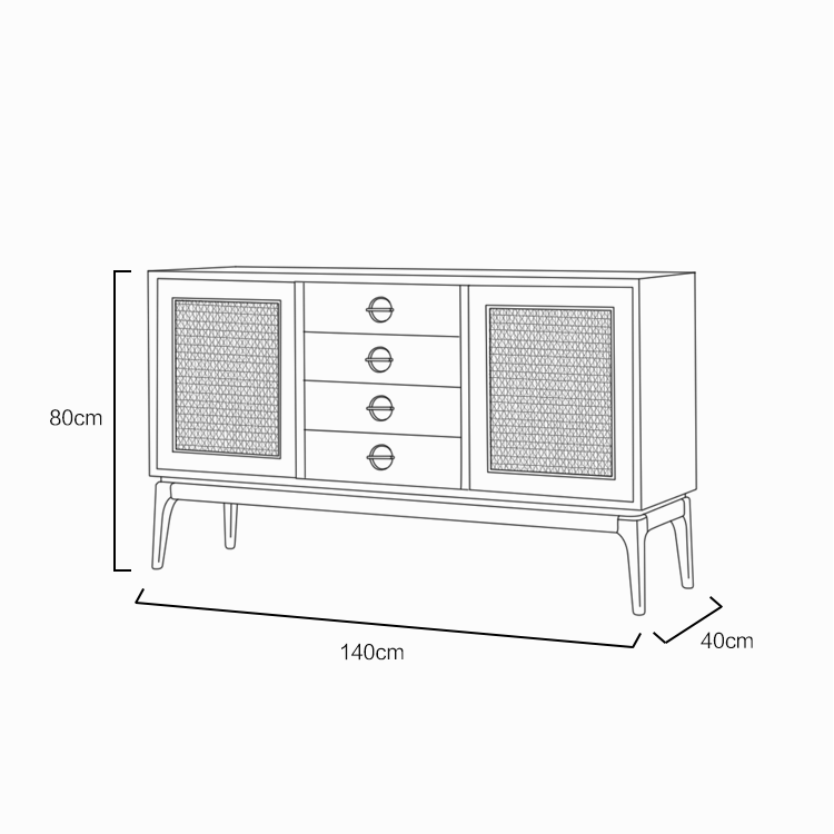 يتميز بوفيه الطعام برف ووحدات تخزبن مميزة وبتصميم حديث يعمل بشكل جيد في تخزين الأدوات المنزلية. يتميز بلمسة نهائية محايدة تنسق مع أي ديكور تقريبًا ، كما أن سطح البوفيه المصنوع من الخشب الكونتر والروطان والأرجل الخشبية يمنحهه بنية صلبة ومتينة إلى جانب تصميم ممتع.