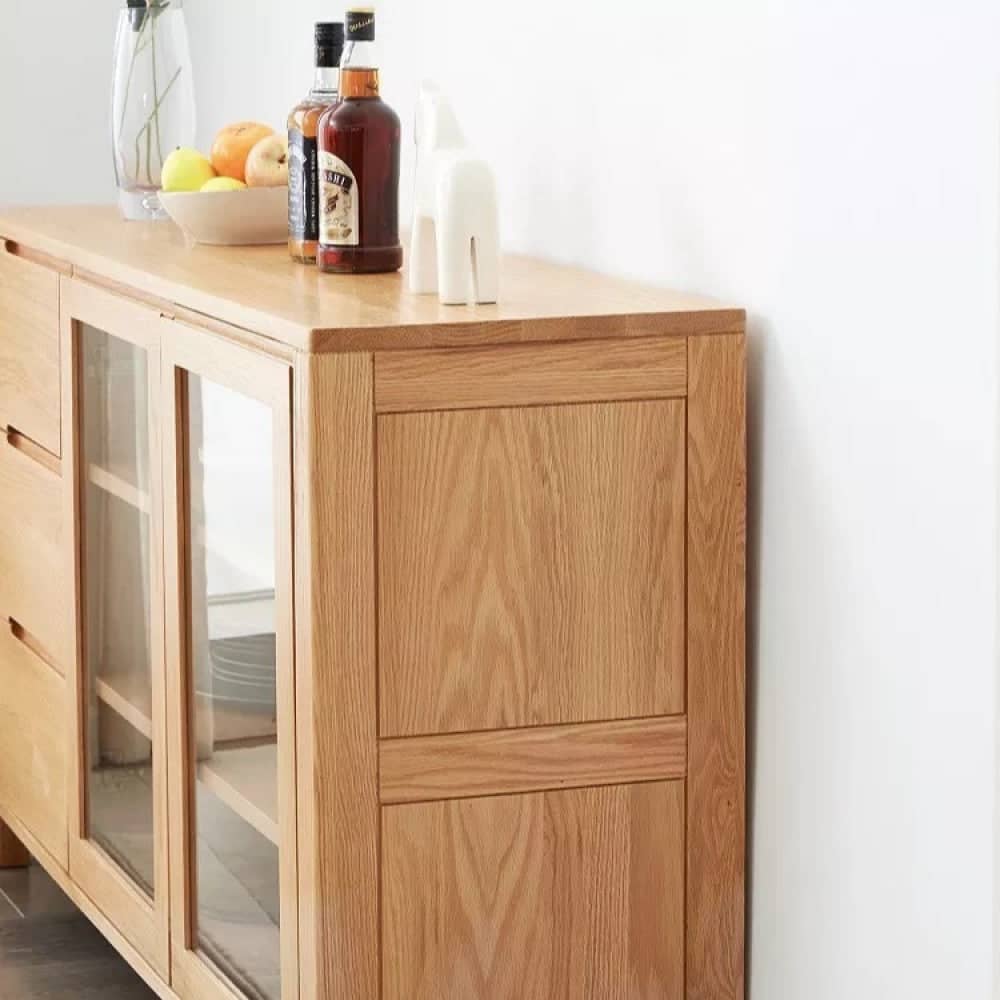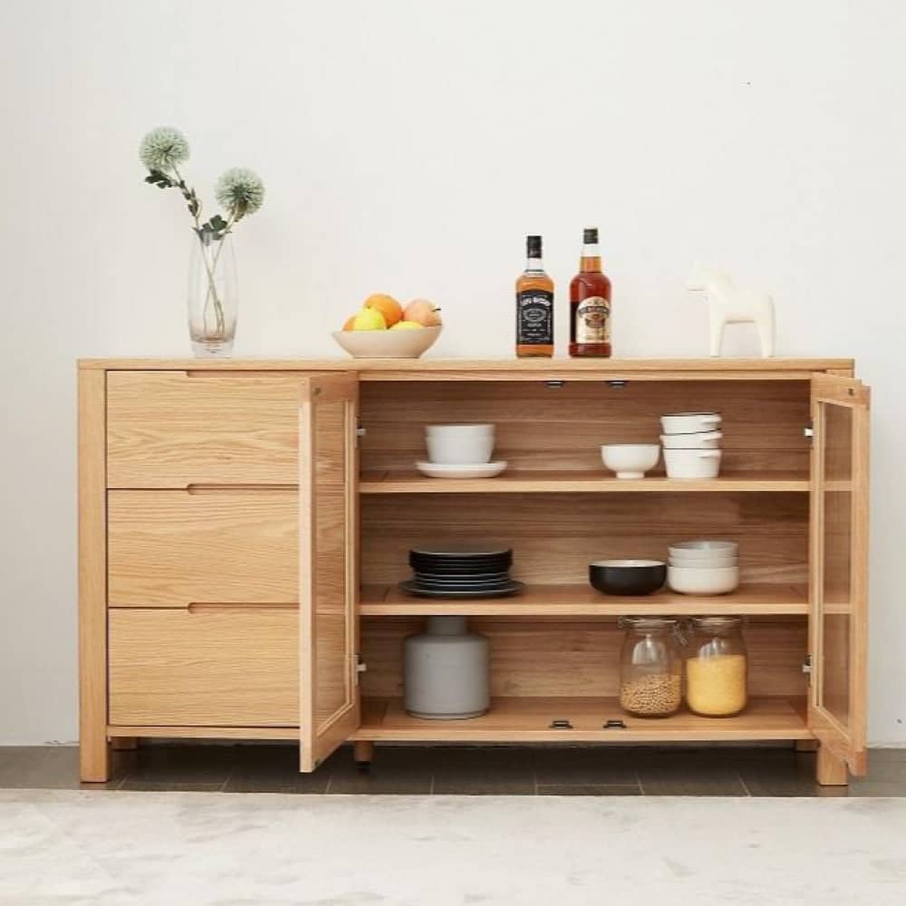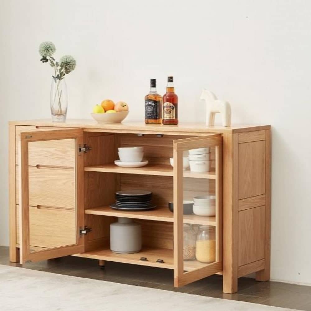 يتميز بوفيه الطعام بأرفف ووحدات تخزبن مميزة وبتصميم حديث يعمل بشكل جيد في تخزين الأدوات المنزلية. يتميز بلمسة نهائية محايدة تنسق مع أي ديكور تقريبًا ، كما أن سطح البوفيه المصنوع من الخشب الزان والزجاج والأرجل الخشبية يمنحهه بنية صلبة ومتينة إلى جانب تصميم ممتع.