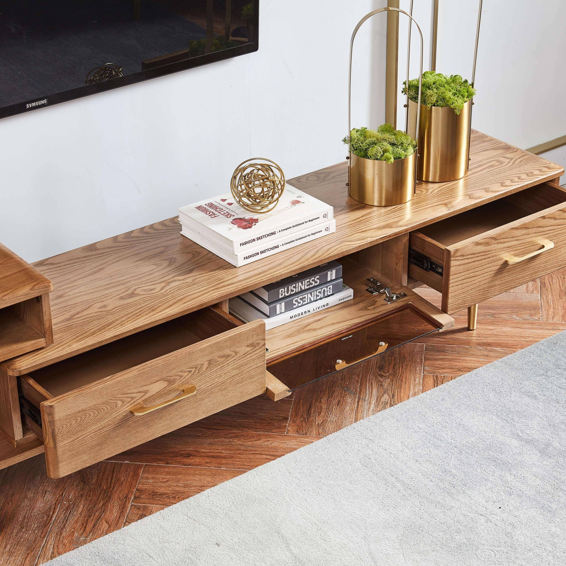 تتميز طاولة التفاز بعددة وحدات للتخزين مع بتصميم عصري وحديث . وتتميز بلمسة نهائية محايدة تنسق مع أي ديكور تقريبًا ، كما أنها مصنوعة من خشب الكونتر والأرجل الصلبة المعدنية لتكمل البنية القوية إلى جانب تصميم ممتع.