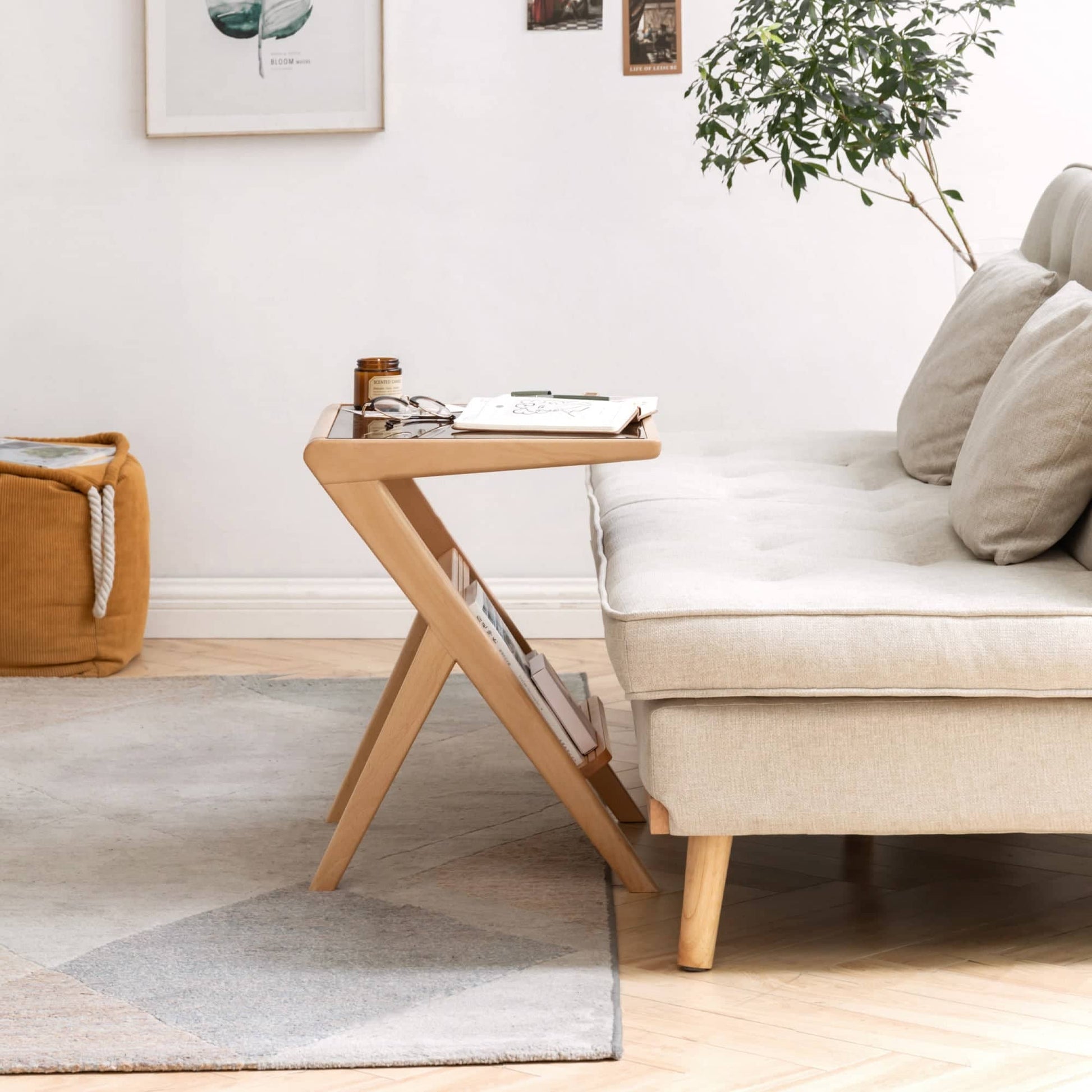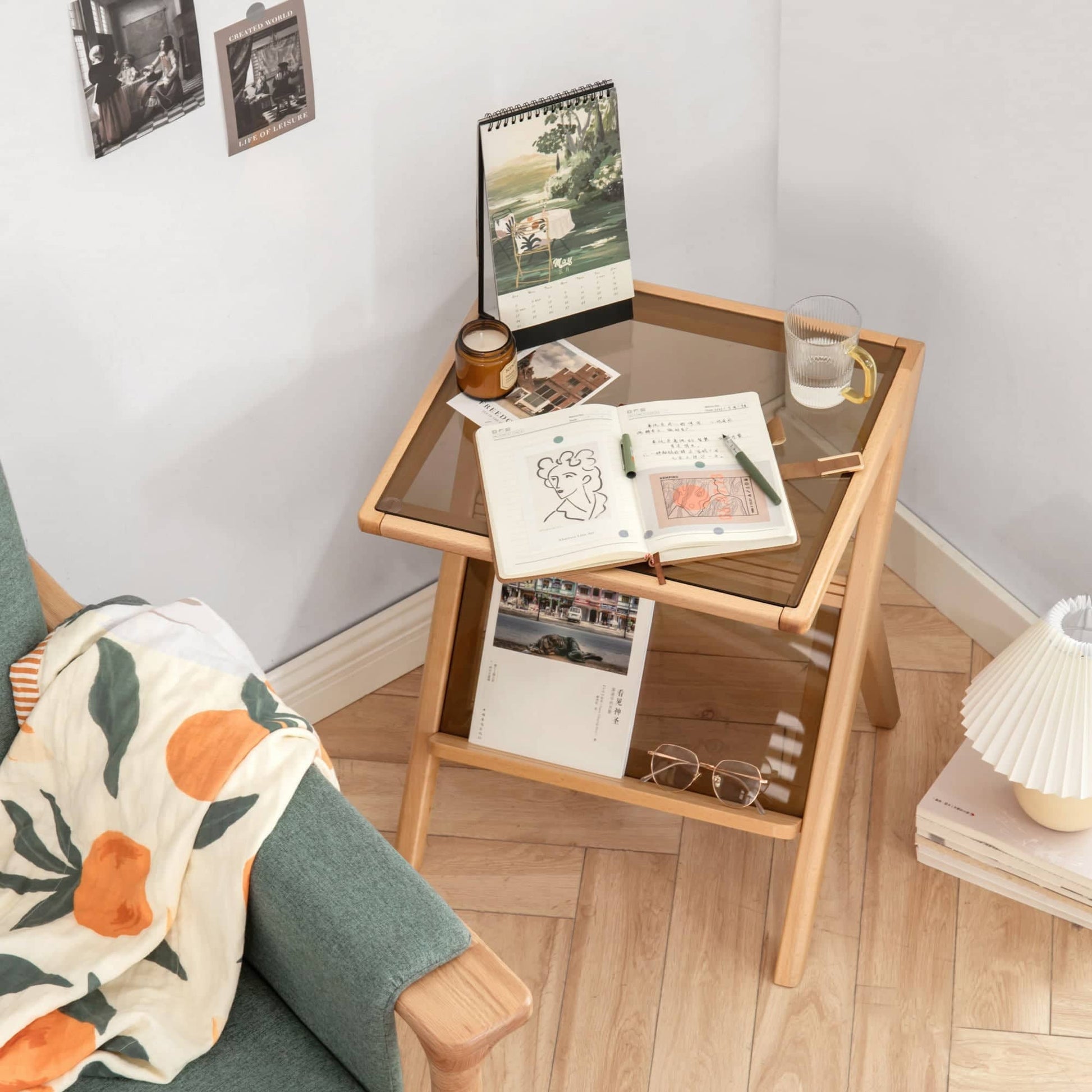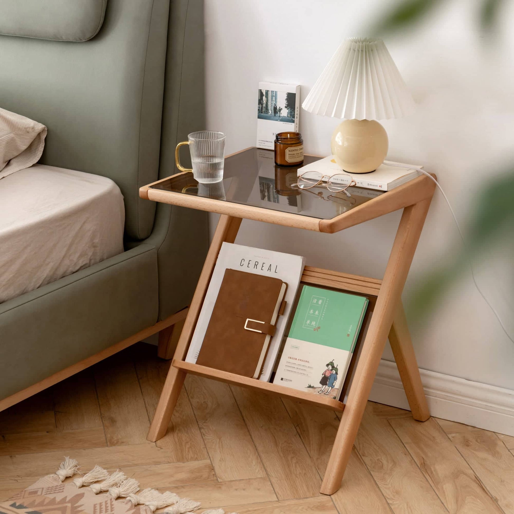 تتميز الطاولة الجانبية بسطح مفتوح مع تصميم عصري وحديث . وتتميز بلمسة نهائية محايدة تنسق مع أي ديكور تقريبًا ، كما أنها مصنوعة من خشب الزان والزجاج والأرجل الصلبة الخشبية لتكمل البنية القوية إلى جانب تصميم ممتع.