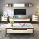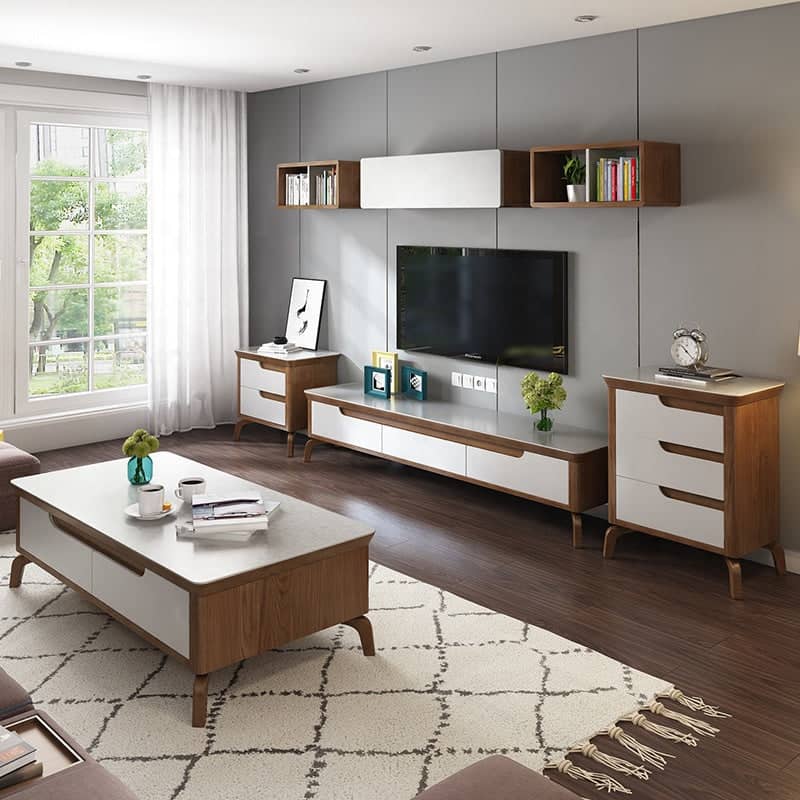 يتميز طقم الطاولات بعدة ارفف و وحدات مع تصميم عصري وحديث . وتتميز بلمسة نهائية محايدة تنسق مع أي ديكور تقريبًا ، كما أنها مصنوعة من خشب الام دي اف والأرجل الصلبة الخشبية لتكمل البنية القوية إلى جانب تصميم ممتع.