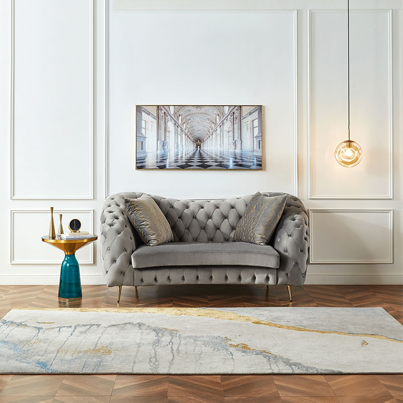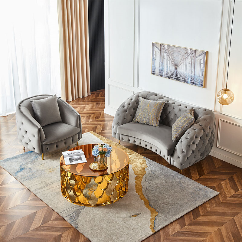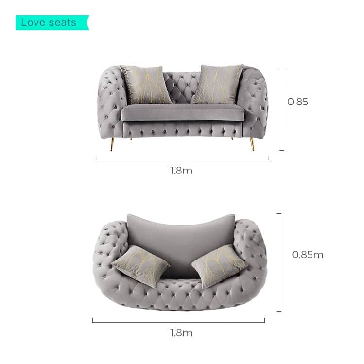 يتميز طقم الكنب بتصميم مميز ومريح للأسترخاء . ويتميز بلمسة نهائية محايدة تنسق مع أي ديكور تقريبًا ، كما أنه مصنوع من قماش المخملي والقاعدة الصلبة المصنوعة من الخشب الزان لتكمل البنية القوية إلى جانب تصميم ممتع.