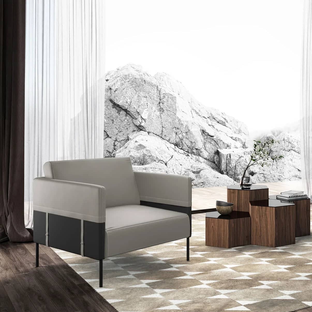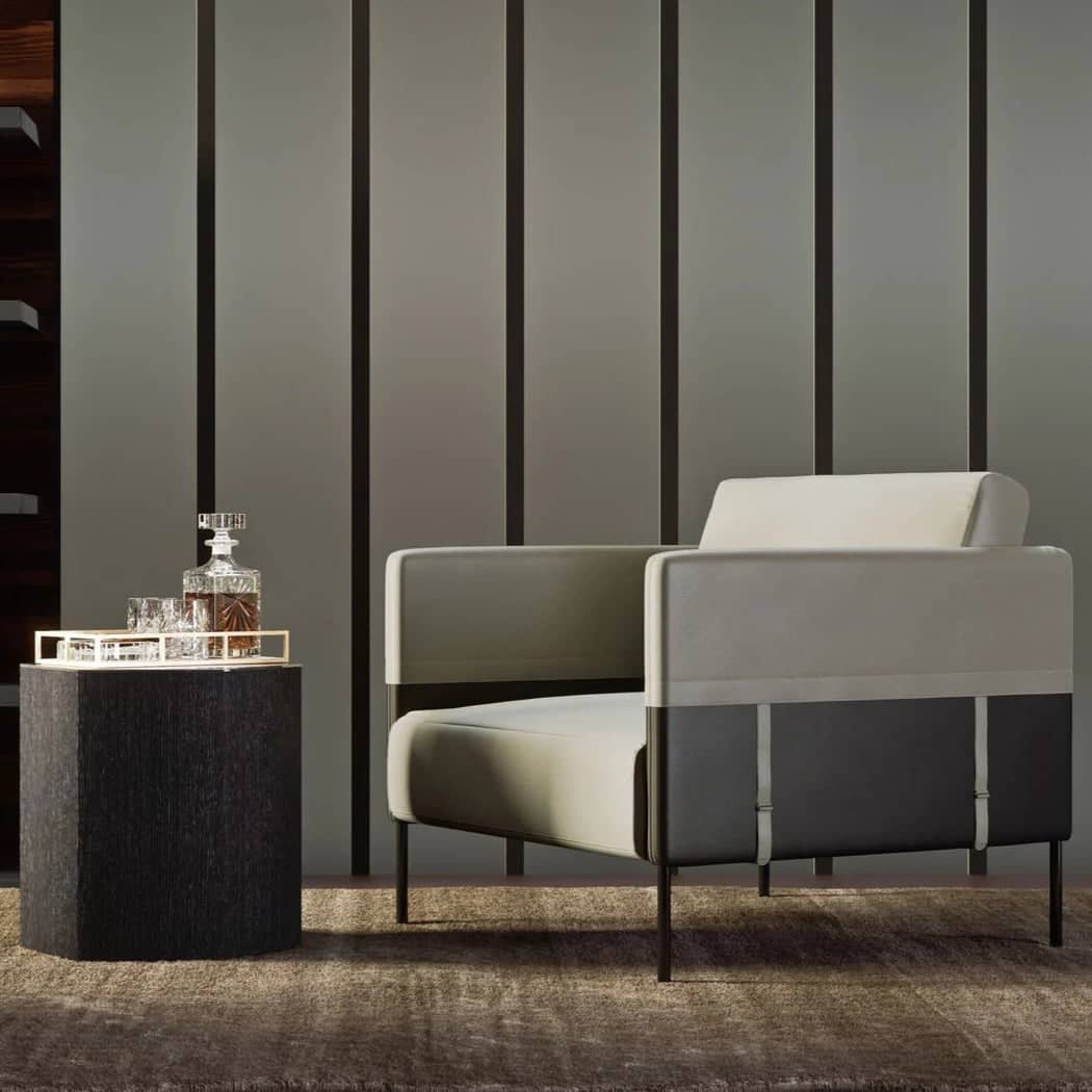 يتميز كرسي الاسترخاء بتصميم مودرن ومريح . ويتميز بلمسة نهائية محايدة تنسق مع أي ديكور تقريبًا ، كما أنه مصنوع من المعدن والجلد وخشب الام دي اف والأرجل الصلبة لتكمل البنية القوية إلى جانب تصميم ممتع.