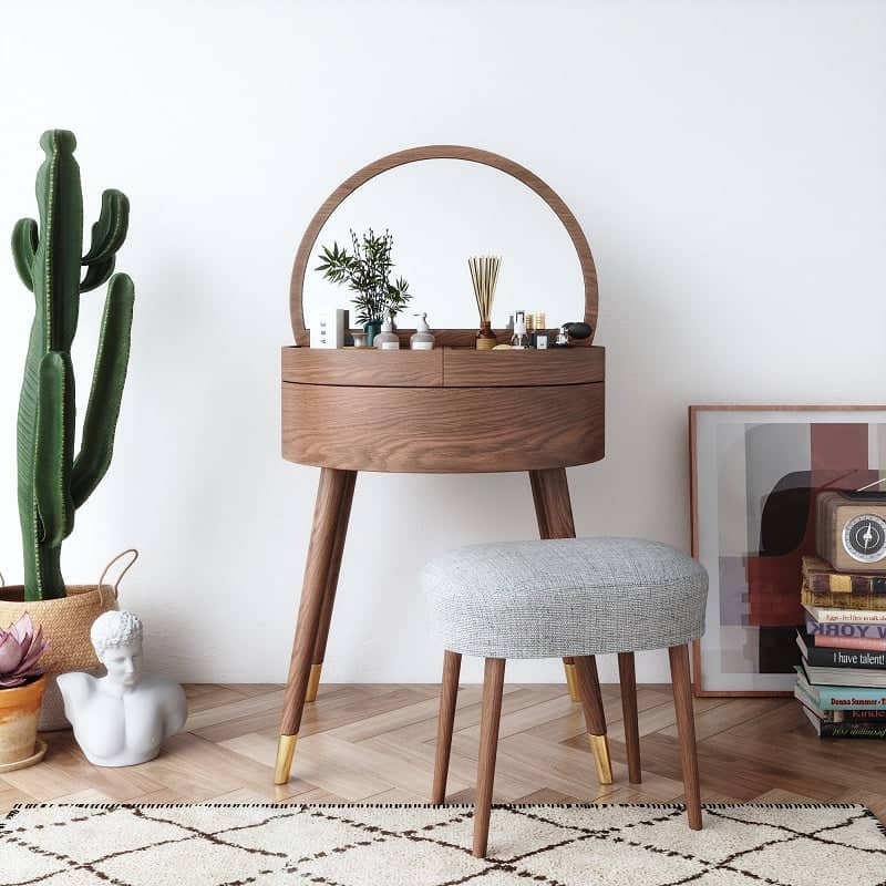 تتميز التسريحة بمرآة عملية ووحدات للتخزين المدمج والمفتوح بتصميم حديث تعمل بشكل جيد في كل من تخزين أدوات التجميل والأدوات المنزلية. تتميز بلمسة نهائية محايدة تنسق مع أي ديكور تقريبًا ، كما أن سطح التسريحة المصنوعة من الخشب الزان والأرجل الخشبية يمنحها بنية متينة إلى جانب تصميم ممتع.