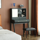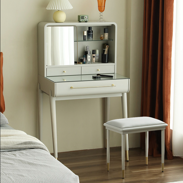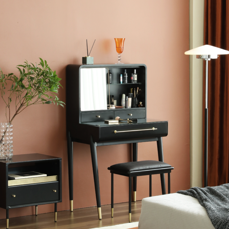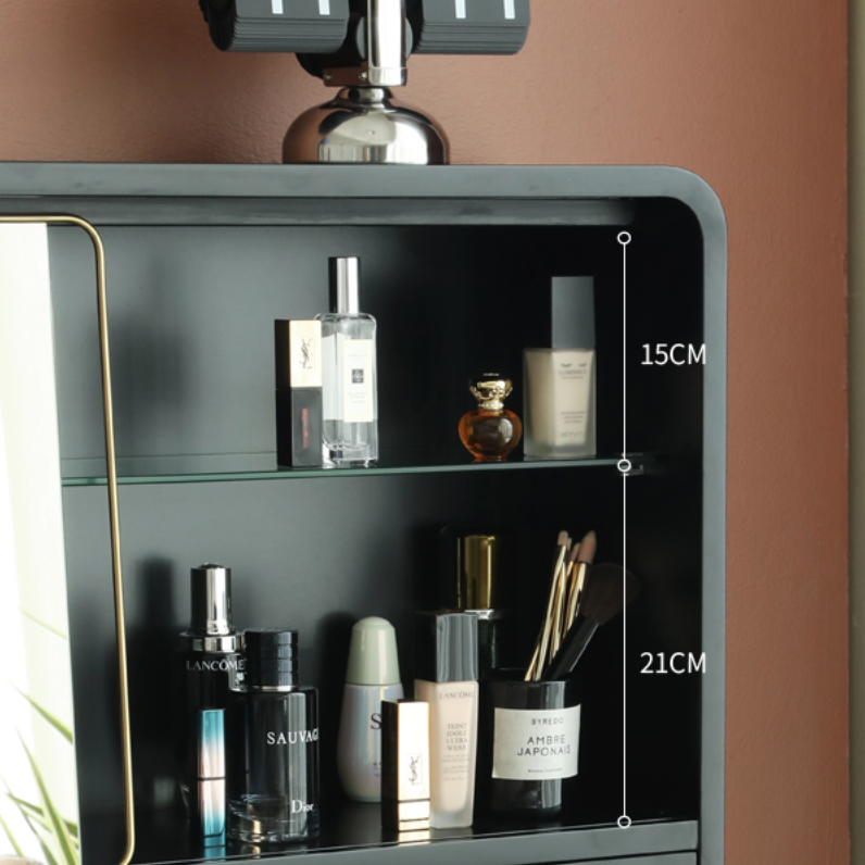 تتميز التسريحة بمرآة عملية ومقعد ووحدات للتخزين المدمج والمفتوح بتصميم حديث تعمل بشكل جيد في كل من تخزين أدوات التجميل والأدوات المنزلية. تتميز بلمسة نهائية محايدة تنسق مع أي ديكور تقريبًا ، كما أن سطح التسريحة المصنوعة من الخشب ام دي اف والأرجل الخشبية يمنحها بنية متينة إلى جانب تصميم ممتع.