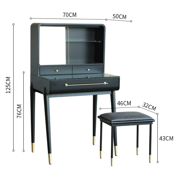 المقاس التسريحة : العمق 50 * العرض 70 * الارتفاع 125 سم / مقاس الكرسي : العمق 32 * العرض 46 * الارتفاع 43 سم