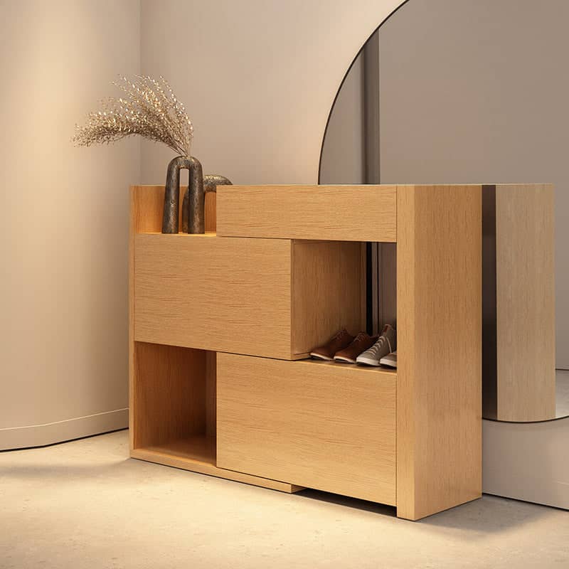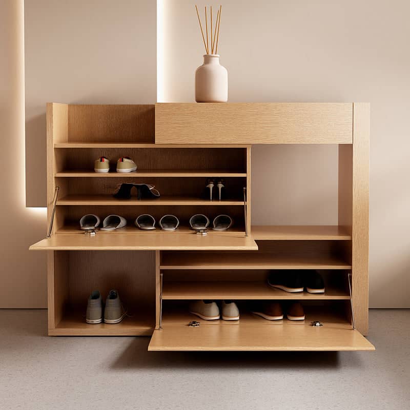 تتميز وحدة تخزين الاحذية بسطح مفتوح وادرج بتصميم مميز . وتتميز بلمسة نهائية محايدة تنسق مع أي ديكور تقريبًا ، كما أن سطح الوحدة المصنوع من الخشب الزان والقاعدة الصلبة الخشبية لتكمل البنية القوية إلى جانب تصميم ممتع.