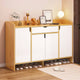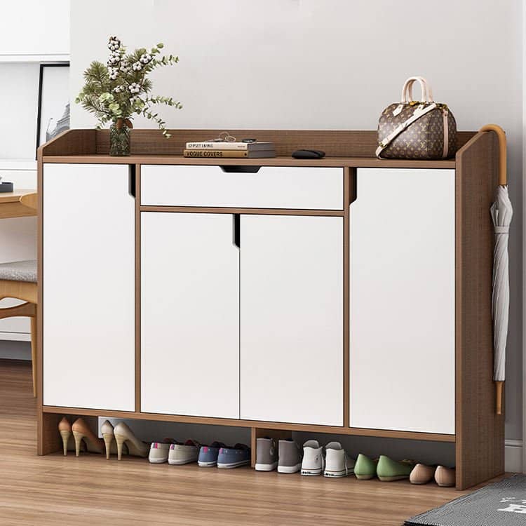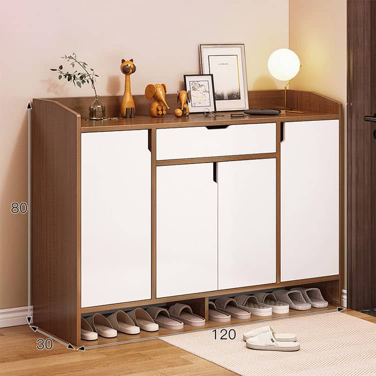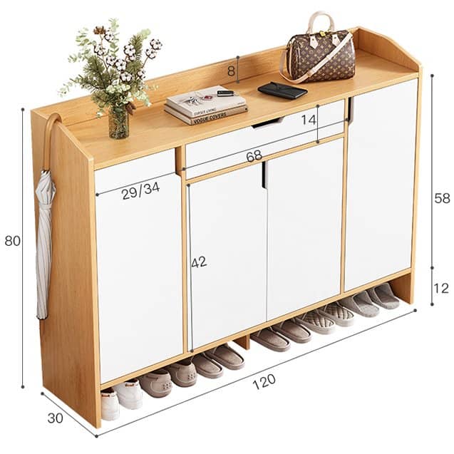 خزانة تخزين الاحذية بسطح مفتوح وادراج قابلة للفتح والقفل بتصميم مميز . وتتميز بلمسة نهائية