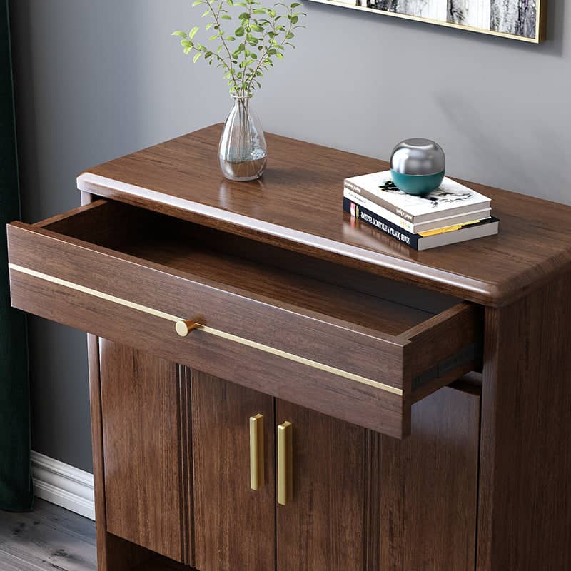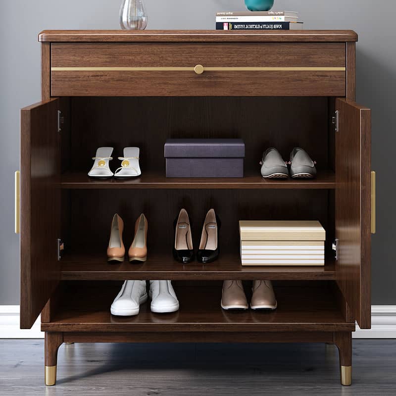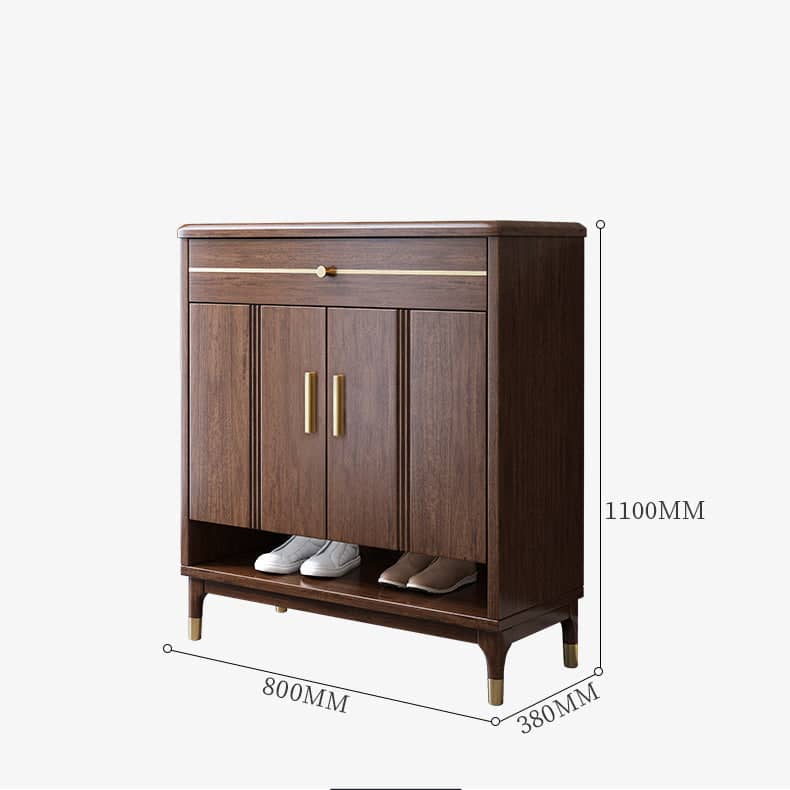 تتميز خزانة الأحذية بسطح مفتوح وحواف ذهبية مميزة مع رف وادراج بتصميم فخم . وتتميز بلمسة نهائية محايدة تنسق مع أي ديكور تقريبًا ، كما أن الوحدة مصنوعة من الخشب الزان والأرجل الصلبة الخشبية لتكمل البنية القوية إلى جانب تصميم ممتع.